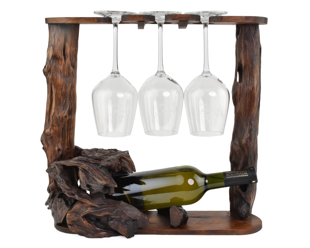 Přírodně vypadající stojan na tři sklenice a láhev vína z teakového dřeva. Vhodný doplněk především do interiéru s dřevěnými prvky. Boční tyče umožňují jednoduché uchopení a přenášení.Parametry: Váha: cca 1,8 kg Rozměry: 38 x 38 cmHloubka: 15 cmRozměr uložiště pro láhev: 10 x 10 cm przeczytaj całość