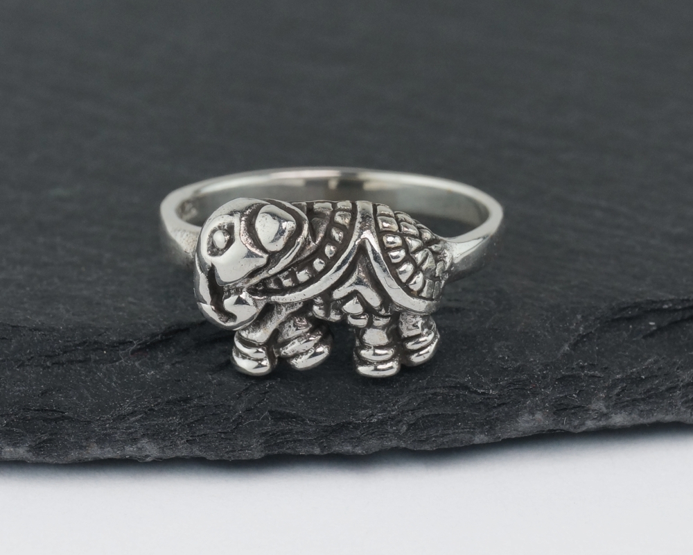 Stříbrný prsten se symbolem slona. Prsten je označen puncem ryzosti. Ryzost: Ag 925/1000