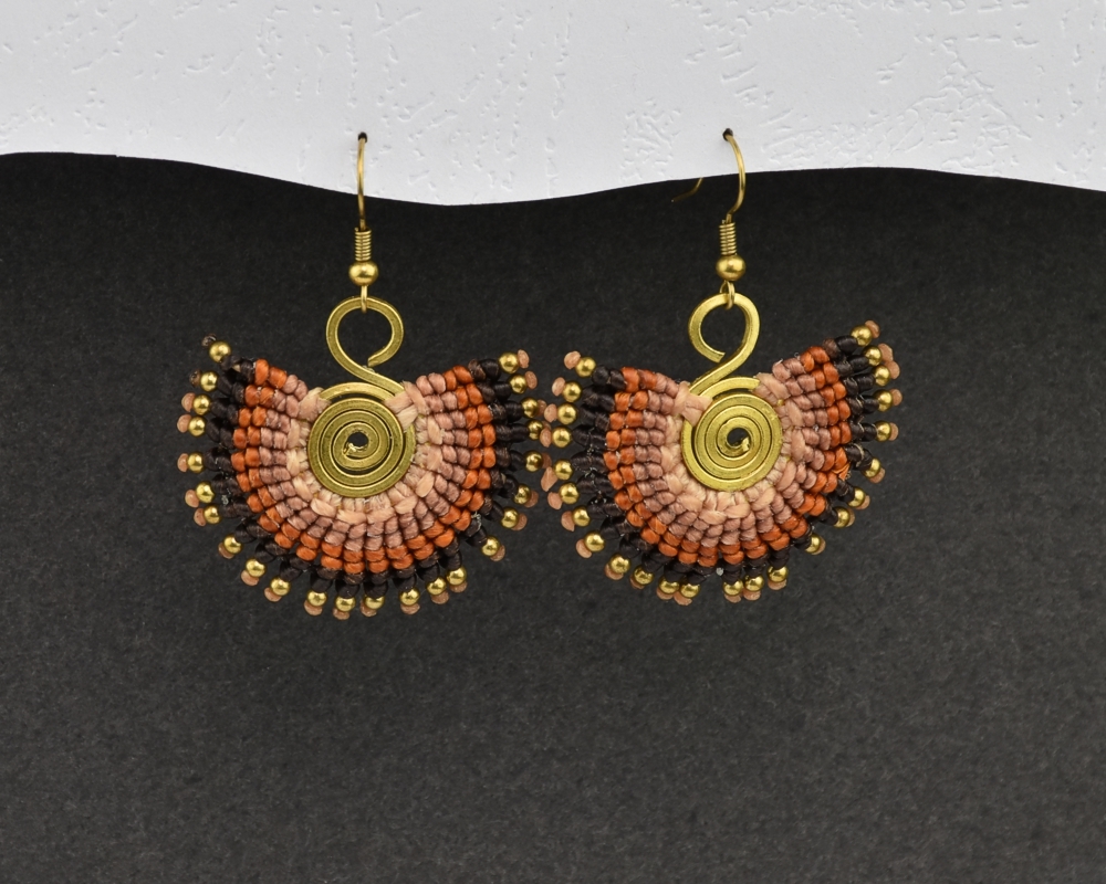 Ručně vyrobené drhané náušnice z voskovaného provázku, na kovovém základu, dozdobené drobnými preličkami.Každý pár těchto naušnic je jedinečný originál.Materiál: kov, voskovaná bavlnkaRozměry: 3,5 x 4 cm przeczytaj całość