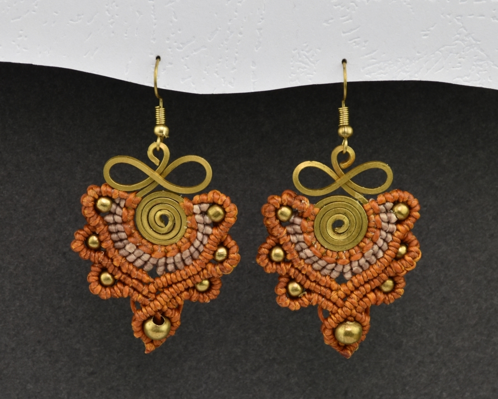 Ručně vyrobené drhané náušnice z voskovaného provázku, na kovovém základu, dozdobené drobnými preličkami.Každý pár těchto naušnic je jedinečný originál.Materiál: kov, voskovaná bavlnkaRozměry: 5 x 3,5 cm przeczytaj całość