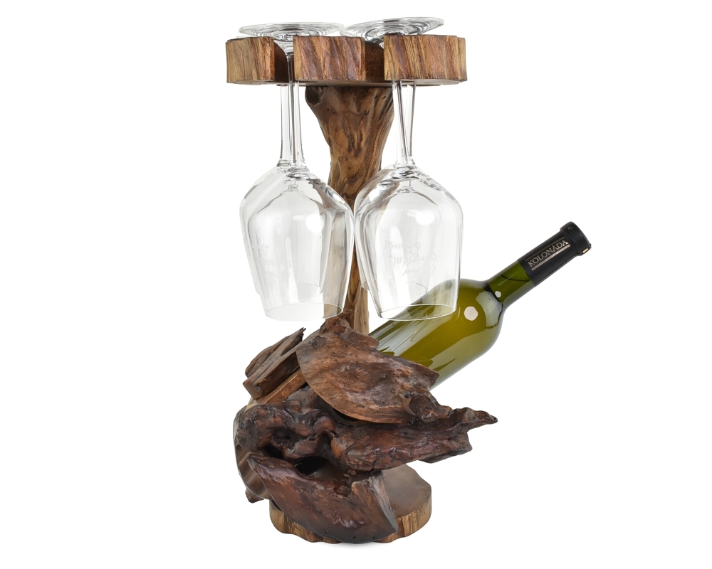 Přírodně vypadající stojan na čtyři sklenice a láhev vína z teakového dřeva. Vhodný doplněk především do interiéru s dřevěnými prvky. Zadní tyč umožňuje jednoduché uchopení a přenášení.Parametry: Váha: cca 1,7 kg Šířka: 22 cmHloubka: 20 cmVýška: 41 cmRozměr uložiště pro láhev: 8 x 8 cm przeczytaj całość