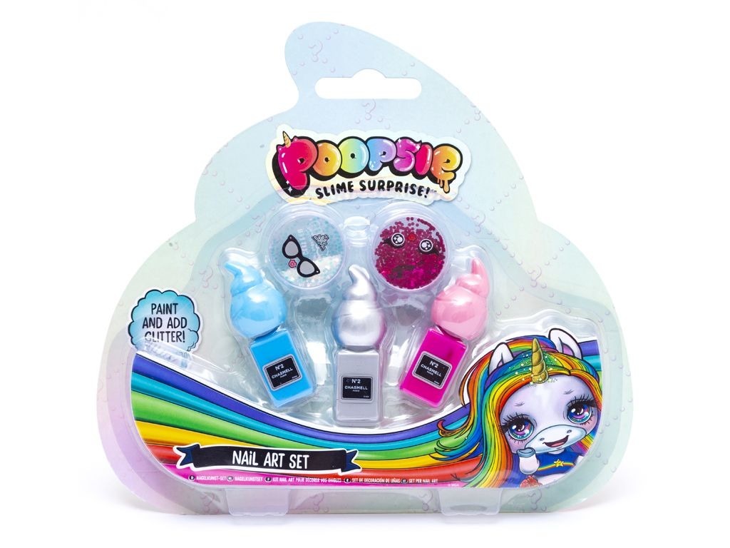 Lak na nehty s třpytkami 3 ks POOPSIE. Balení obsahuje 3 ks laků na nehty v barvách Poopsie – růžová, stříbrná a světle modrá, 1× krabičku s třpytkami a 1× krabičku se samolepkami. Dermatologicky testováno. przeczytaj całość