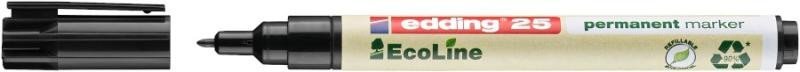 Permanentny marker edding 25 z ekologicznej linii EcoLine ma korpus wykonany przynajmniej w 90% z materiałów pochodzących z recyklingu. Nadaje się do znakowania niemal wszystkich materiałów (szkło, tworzywo sztuczne, metal, papier, karton, drewno). Szybkoschnący, światłotrwały, wodoodporny i odporny na ścieranie tusz na bazie alkoholu nie zawiera toluenu ani ksylenów. Marker jest ponownie napełnialny (wkład tuszu edding MTK25, T25, T100, T1000), a jego końcówki są wymienne. Możliwość napełnienia wypisanego markera oraz wymiany końcówki pomaga zmniejszyć ilość odpadów biurowych. Zastosowanie w produkcji, magazynach, logistyce, biurach, gospodarstwach domowych, ogrodach i warsztatach. Do użytku wewnątrz i na zewnątrz. Przedłużając żywotność markera, przyczyniasz się do ograniczenia ilości odpadów komunalnych. Produkt neutralny klimatycznie zgodnie z ClimatePartner (ID 13742-1910-1001). Okrągła końcówka. Szerokość linii: 1 mm. Wyprodukowano w Niemczech.
