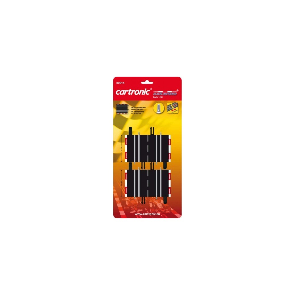 Balíček obsahuje 2 ks roviny v měřítku 1:43 pro rozšíření automobilové závodní dráhy Cartronic Car-Speed. Kolejnice jsou vyrobeny z vysoce kvalitního ABS materiálu s hotovými elektrickými vodiči a jsou potištěny atraktivními červeno-bílými okrajovými proužky.Veškeré kolejnice Speed-Car jsou také kompatibilní s kolejnicemi Carrera Go.