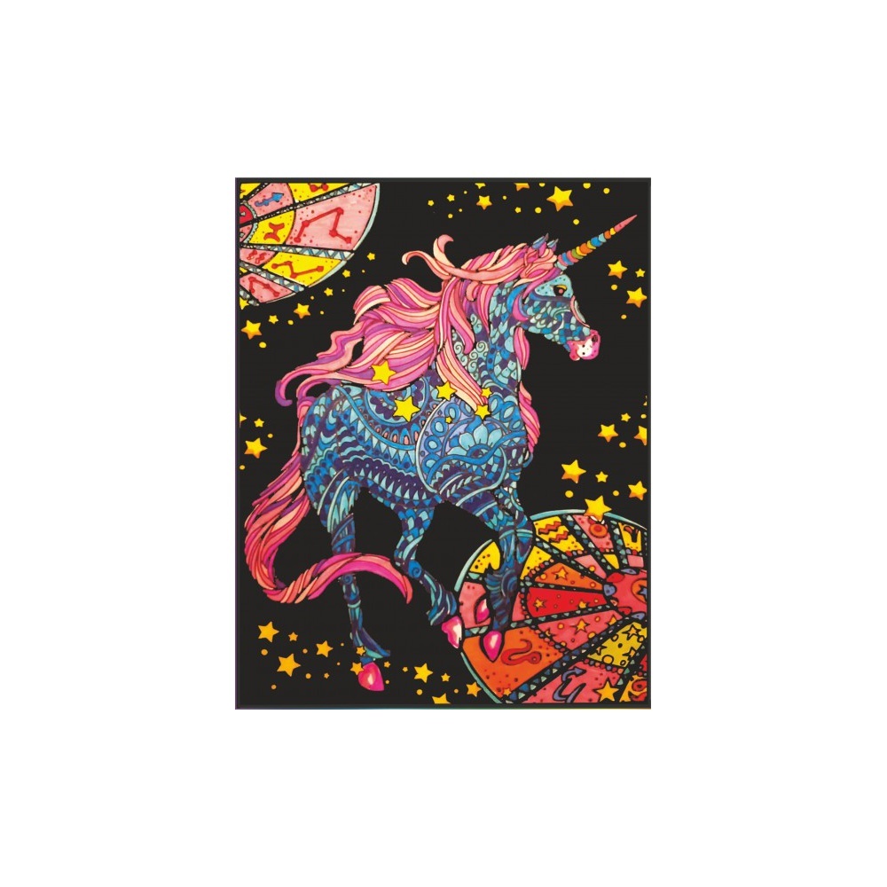 Duży aksamitny obrazek do kolorowania, motyw jednorożca. Szablona do kolorowania wykonana jest z aksamitu, co ułatwia wypełnianie kolorami. Obrazek można kolorować markerami, kredkami lub świecami woskowymi. Krawędzie motywu są wyraźnie zaznaczone aksamitem i zapobiegają wyjeżdżaniu poza linie. Obrazek można pokolorować według dołączonego wzoru lub puścić wodze fantazji. Rozmiar: L 47x35 cm. Nadaje się dla dzieci od 3 lat.
