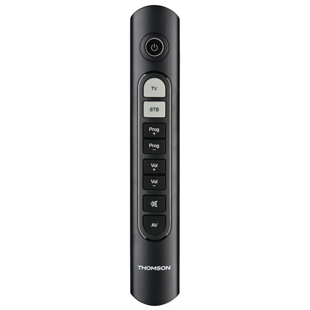 - kompaktní štíhlé provedení s 9 velkými tlačítky: vypínač, TV/STB, předvolby +/-, hlasitost +/-, ztlumení, AV vstup