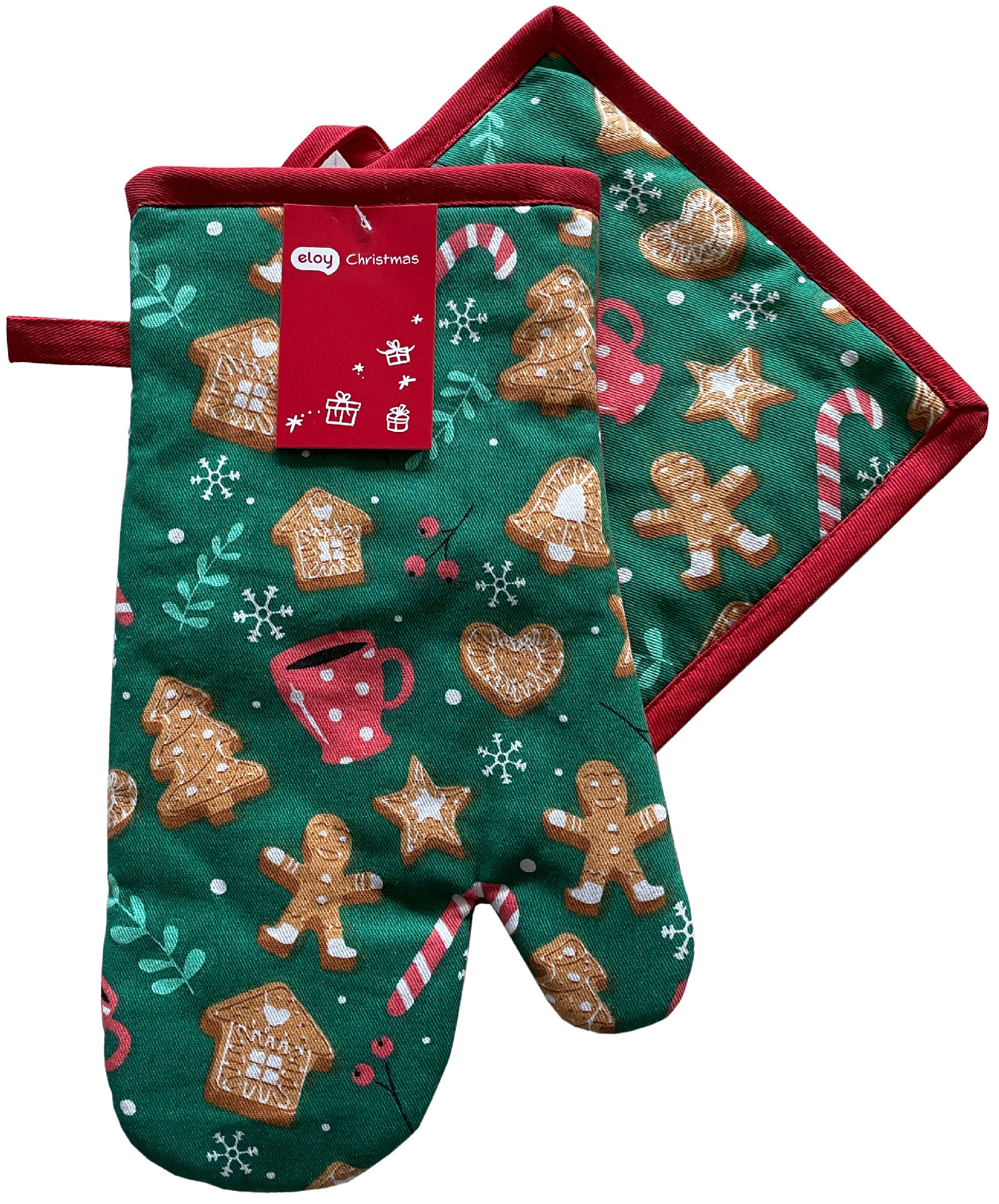 Piękny zestaw prezentowy: kuchenne rękawice z łapką z pięknym oryginalnym zimowym motywem. 100% bawełna.