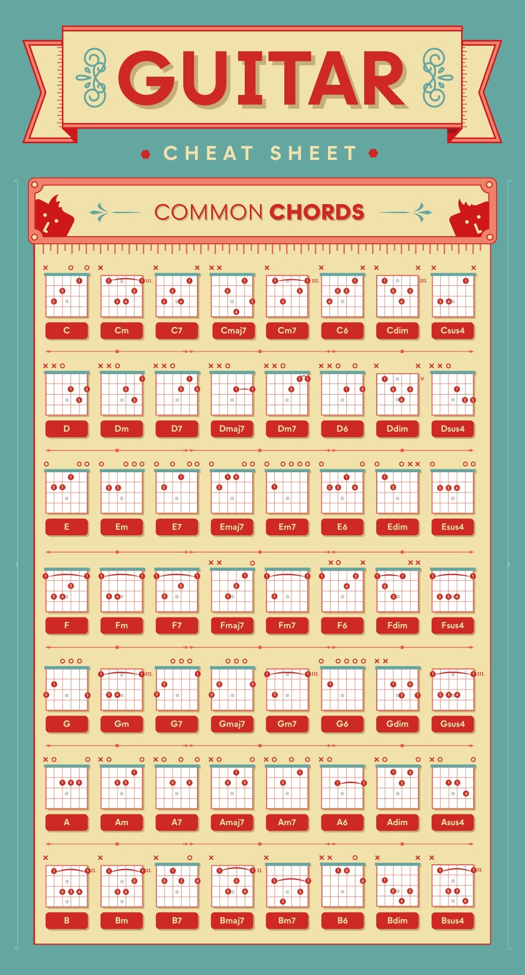 Plakát s prstoklady nejpoužívanějších kytarových akordů. przeczytaj całość