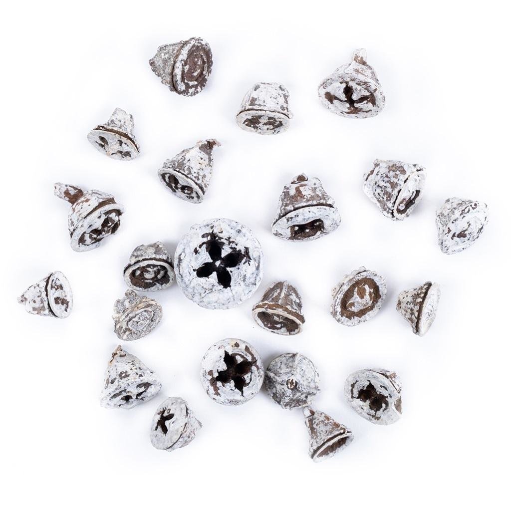 Suszone owoce eukaliptusa o charakterystycznym kształcie przypominającym dzwonki. Naturalne owoce zostały pokryte warstwą białej farby, która podkreśla nieregularną fakturę ich powierzchni.Delikatnie bielone owoce egzotyczne to ciekawy dodatek do projektów florystycznych, kreatywnych kompozycji...
