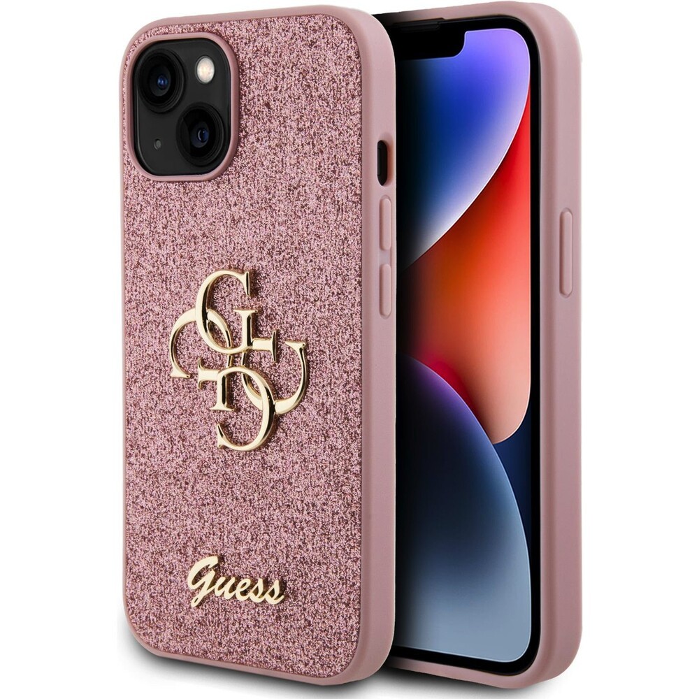 Guess PU Fixed Glitter 4G Metal Logo kryt iPhone 15 růžový