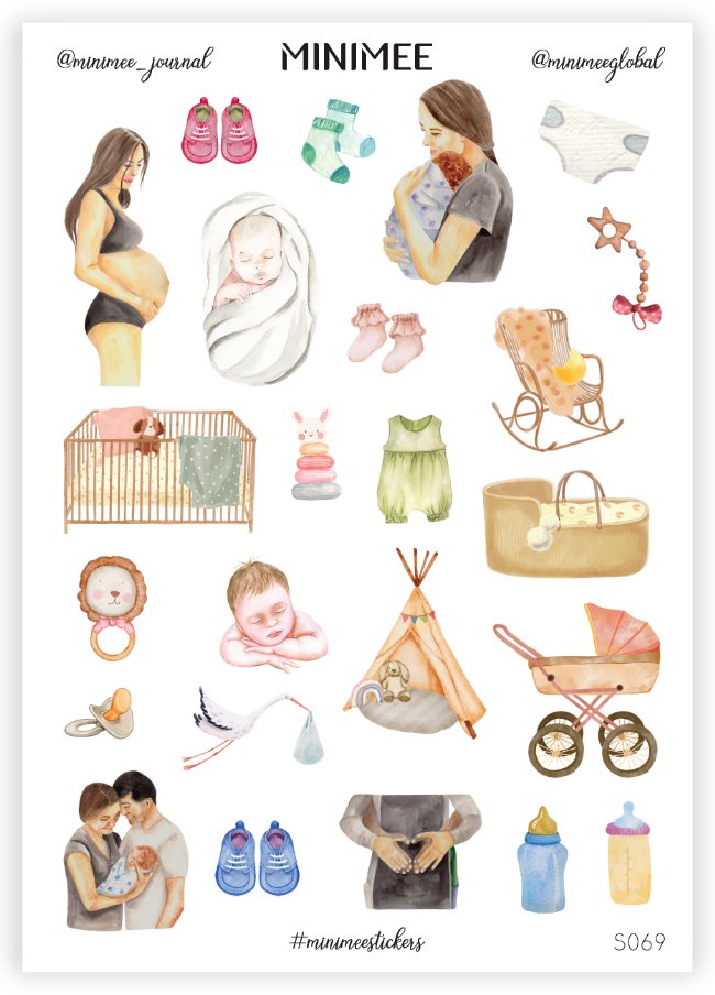 Piękne wycinane naklejki na arkuszu A5, które zachwycają nie tylko swoim wzornictwem. Doskonale pasują do papieru notesu MINIMEE. Wysokiej jakości biała naklejka o matowym, naturalnym wyglądzie.Arkusz zawiera zestaw naklejek z motywami ciążowymi: wyposażenie dziecięce, zabawki i brzuchy... przeczytaj całość
