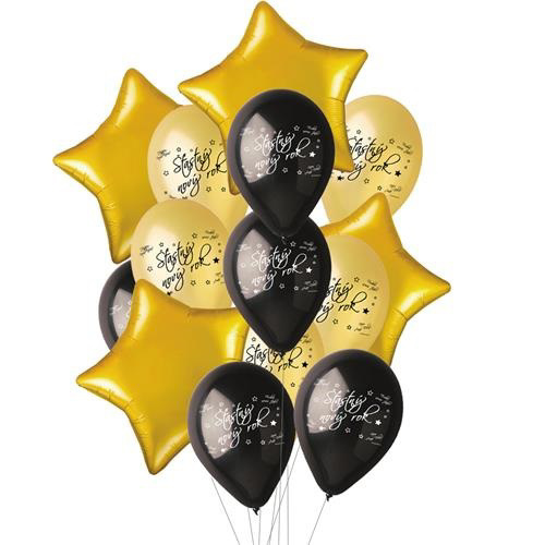 Sada prémiových latexových balonků s českým potiskem - Šťastný nový rok a fóliových balonků ve zlaté a černé barvě. Velikost latexových balonků je 30 cm, velikost fóliových balonků je 45 cm. Balonky jsou vyrobeny v EU.