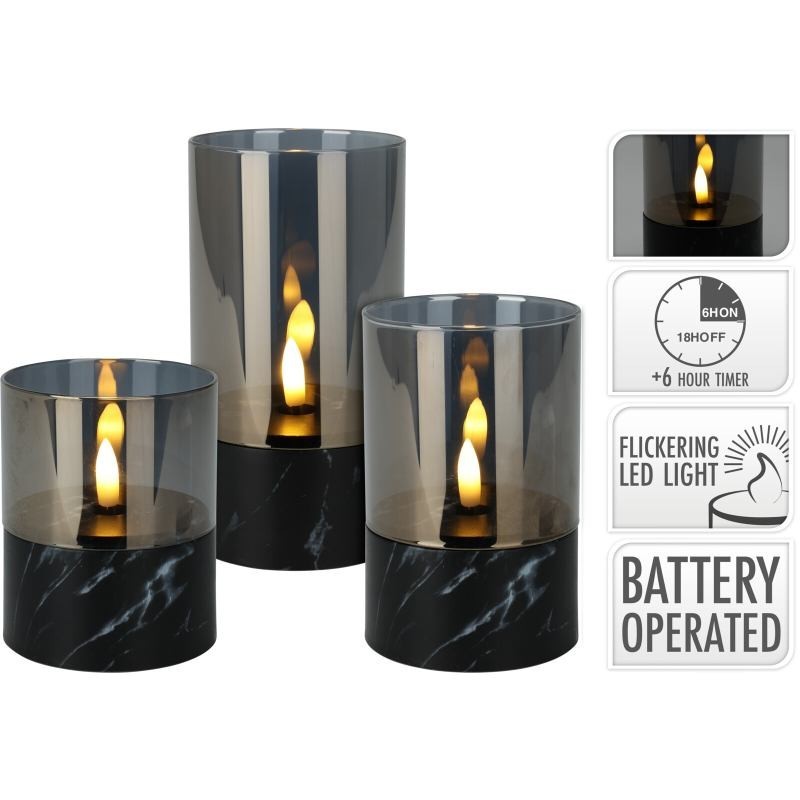 LED CANDLE IN GLASS, SET OF 3PCS, 1 LED WICK FLAME, PLASTIC AND GLASS, SIZE CANDLES; 80X100MM, 80X125MM AND 80X150MM, BLACK MARBLE FINISH ON BASE, GREY GLASS, IP44 BATTERY BOX, 2X AA NOT INCLUDED, TIMER FUNCTION: 6HRS ON / 18HRS OFF/ 260X85X160MM, Colorbox + bubble foil (BBW-C) / CFT... przeczytaj całość
