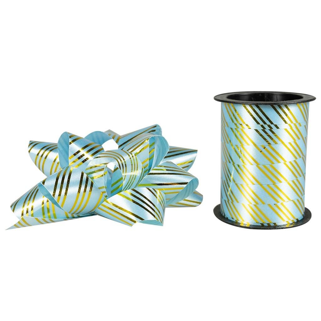 Zestaw do dekoracji prezentów wykonany z tworzywa sztucznego w kolorze niebieskim. W skład zestawu wchodzi rozeta oraz wstążka na szpuli. Produkt zdobiony jest złotymi, drobnymi paseczkami. Komplet do pełnej dekoracji opakowanego prezentu. Wymiary produktów: rozeta 10 cm, długość taśmy 100 cm. przeczytaj całość