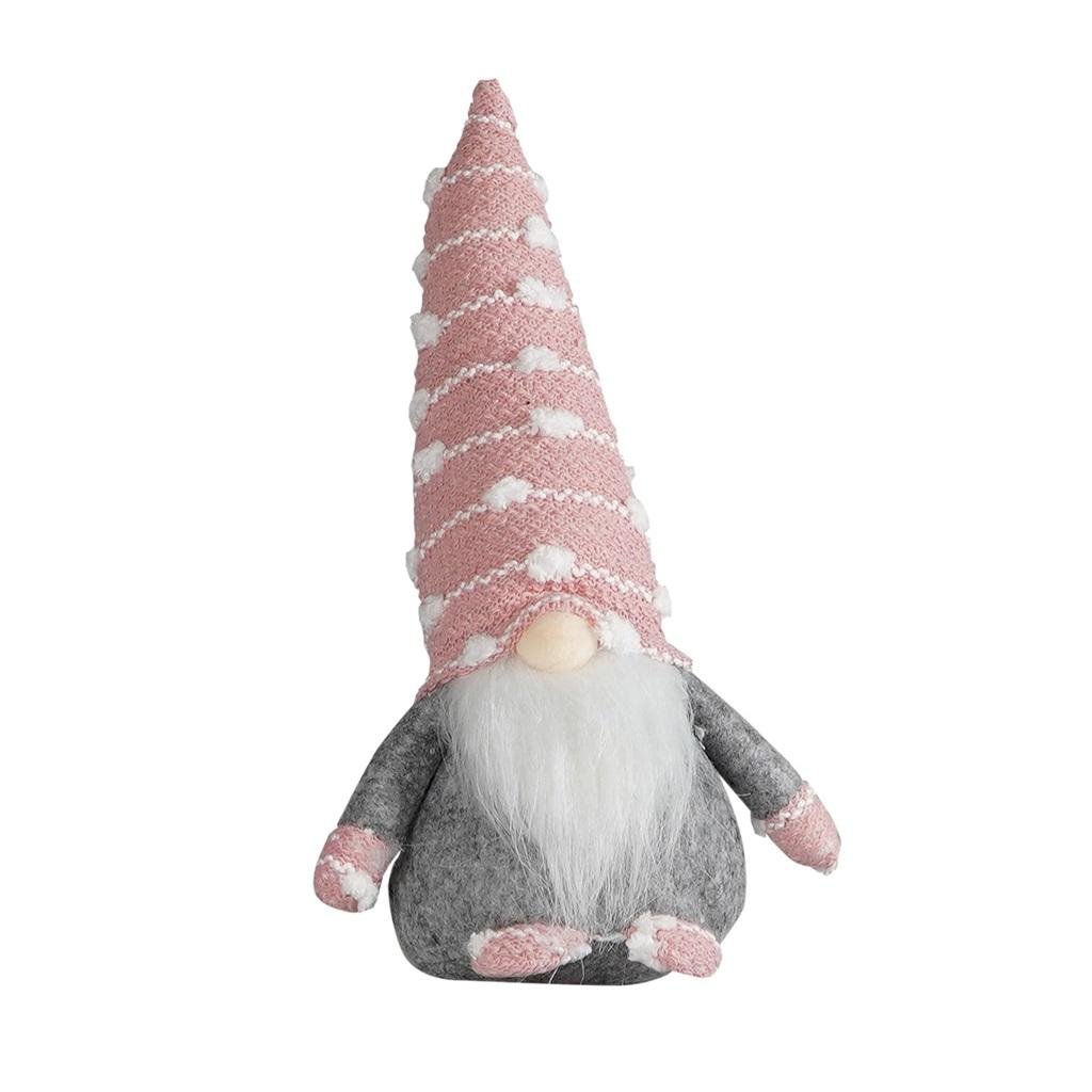 Skrzat dekoracyjny z puchatą brodą. Wykonany z miękkiego filcu i materiału w kolorze różowym. Dekoracja stojąca, dół ozdoby został obciążony, aby umożliwić stabilne jej postawienie. Skrzat ma długą, szpiczastą czapkę materiałową w wypukłe, miękkie kropki. Uniwersalna dekoracja świąteczna pasująca do każdego wnętrza lub ciekawy pomysł na prezent. Skrzat o wysokości 32 cm.