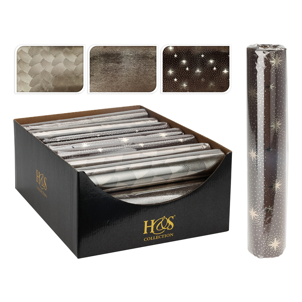 Středový pás v hnedé barvě pro sváteční stolování s lesklou šampaň fólií / 3 vzory.šířka 28 cmnávin 1,5 mMateriál: 100% Polyester s fóliíCena je za 1 kus. przeczytaj całość