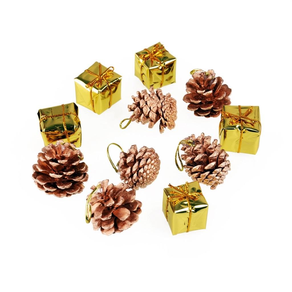 Zestaw ozdób do zawieszenia na choince. Wymiary szyszek: 3,5 cm, wymiar prezencików: 2,5x2,5x2,5 cm. przeczytaj całość