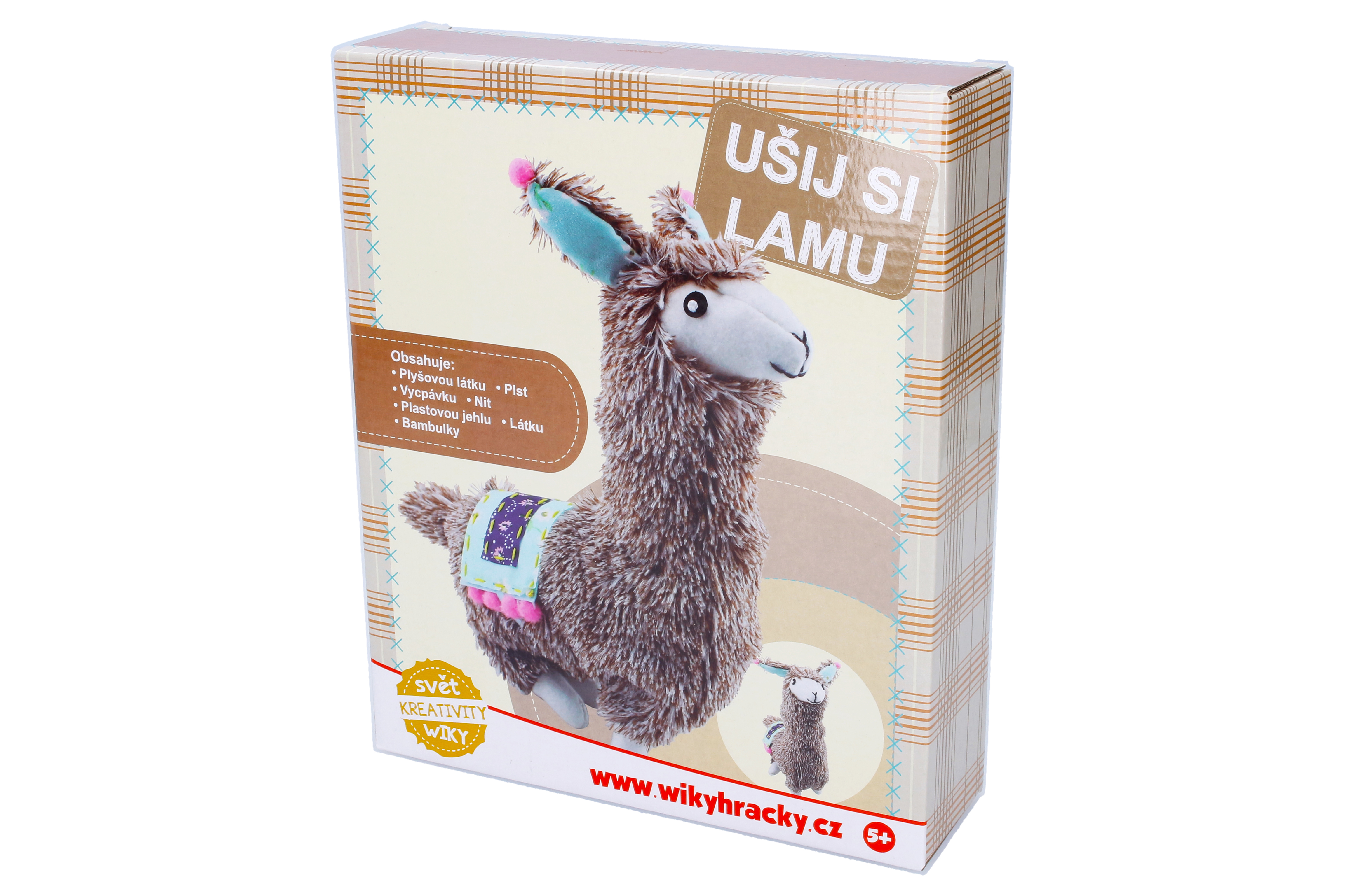 Kreativní set Ušij si lamu. Set obsahuje plyšovou látku, plst, vycpávku, nit, plastovou jehlu, látku, bambulky. przeczytaj całość