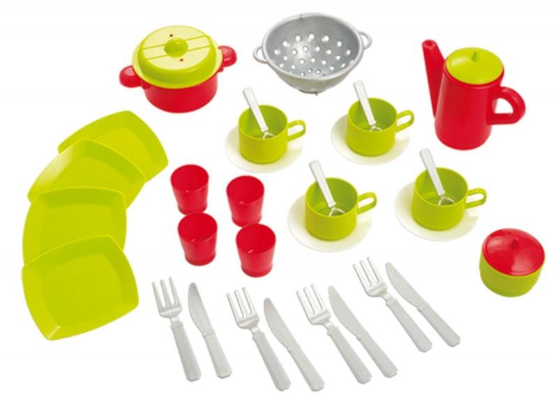 Velká průhledná taška se zipovým zavíráním obsahuje čtyři talíře, sadu čtyř příborů, čtyři pohárky, čtyři plastové hrníčky s podšálky, konvičku, cukřenku, síto a hrnec s pokličkou. Vše plastové. Vhodné pro děti od 18 měsíců. Velikost tašky 29x12x30 cm. przeczytaj całość