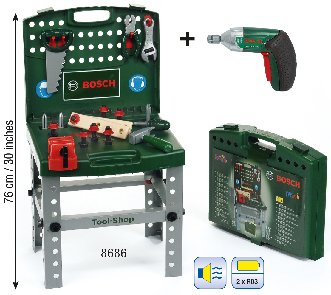 Pracovní stůl Bosch. Spoustu nářadí, se kterým může malý opravář všechno opravit. Pracovní stůl se dá lehce složit do kufříku. Součástí je aku šroubovák na baterie, které nejsou součástí balení 2X R03. Vhodné pro děti od 3 let. przeczytaj całość