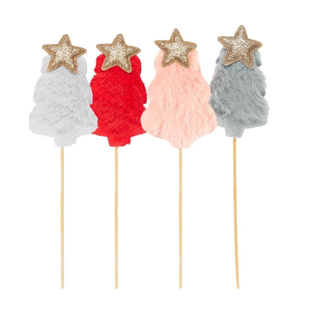 Świąteczna dekoracja na piku w kształcie choinki. Choinka pokryta jest miękkim futerkiem. Na szczycie ozdoby znajduje się złota, błyszcząca gwiazda. Patyczek umożliwia umieszczenie dekoracji w donicy, wazonie, jako dodatek do świątecznego bukietu, kosza prezentowego. Dostępne kolory: - różowy, - szary, - biały, - czerwony. Wysokość choinki z patyczkiem wynosi 22 cm.