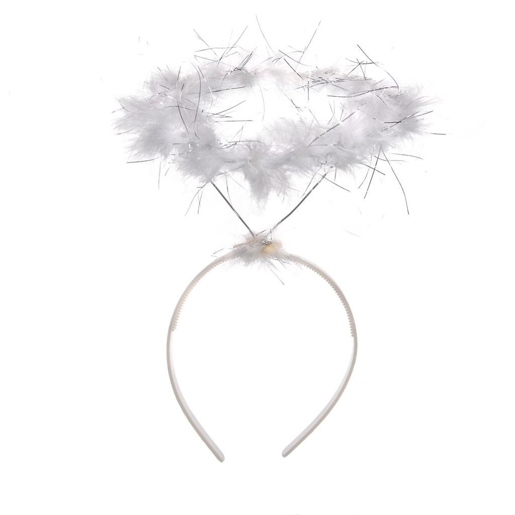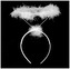 Piórkowa aureola na białej opasce. Wymiary: opaska 12x13 cm, drucik 9 cm, średnica aureoli ok 16 cm przeczytaj całość