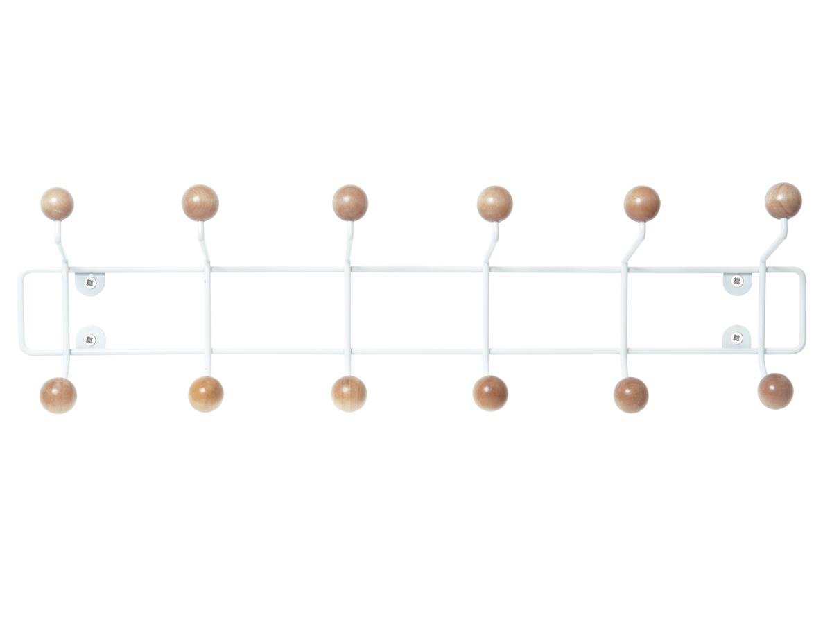 Nástěnný věšák je v bílém provedení s ozdobným dřevěným kulatým zakončením.