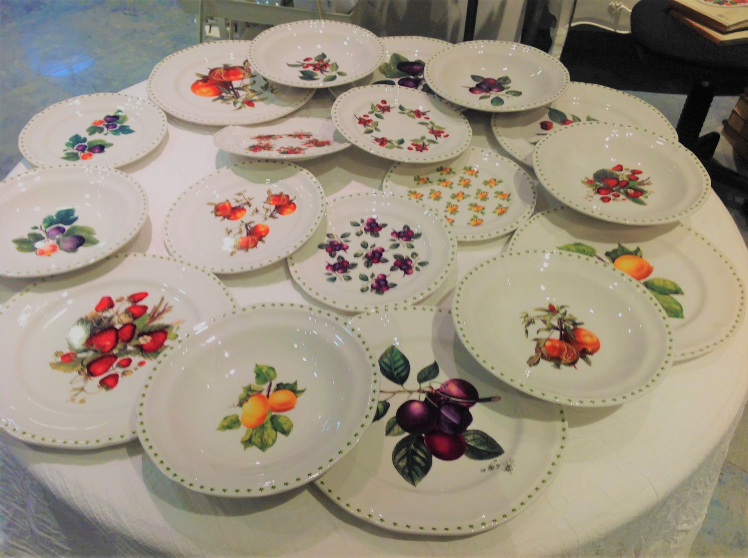 18ti dílná porcelánová sada talířů s motivem ovoce.