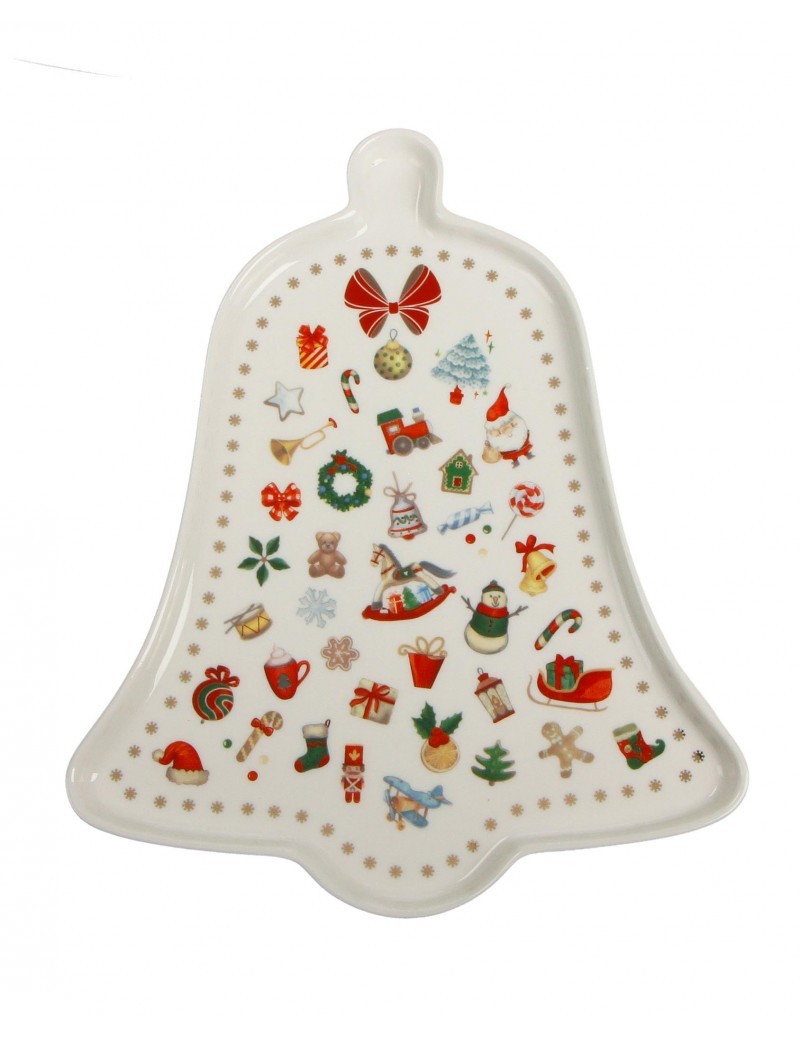 Servírovací tác z porcelánu v bílé/červené barvě s vánočním motivem ve tvaru zvonu. Ozdobí váš slavnostní stůl nejen na Vánoce.