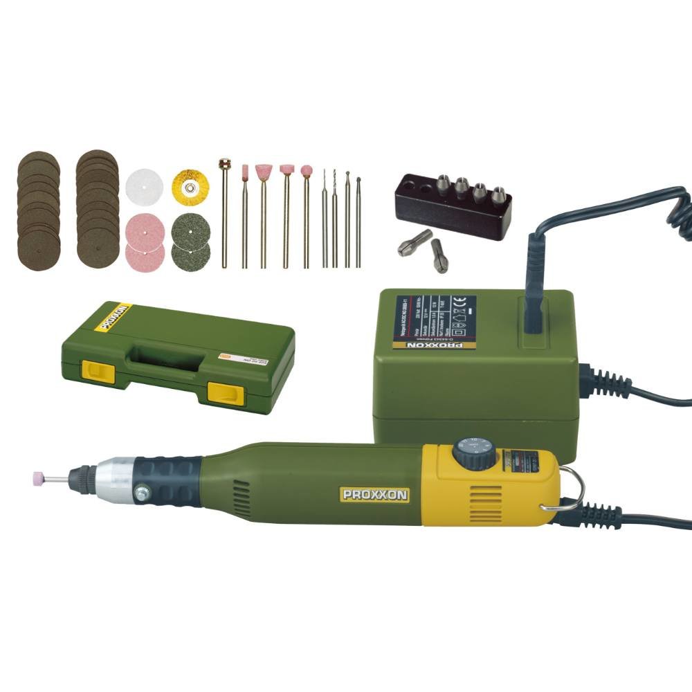 Kompletní modelářská sada Proxxon na vrtání, kartáčování, čištění, frézování, broušení, leštění,odrezování, řezání, gravírování a cizelování. Vhodné zejména na opracování skla, keramiky, oceli, ušlechtilých kovů, plastů a minerálů. Pro elektroniku, modelářství, jemnou mechaniku, šperkařství,...
