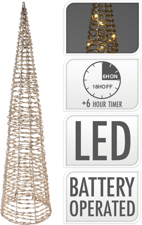 Kovový jehlan s 30 LED diodami teplé bílé barvy a zlatými glitry. Napájení 3x AA bateriemi (nejsou součástí výrobku). Součástí adaptéru IP20 časovač 6/18 h.Materiál: kov, plastové glitryRozměry:výška 60 cmprůměr 16 cm przeczytaj całość