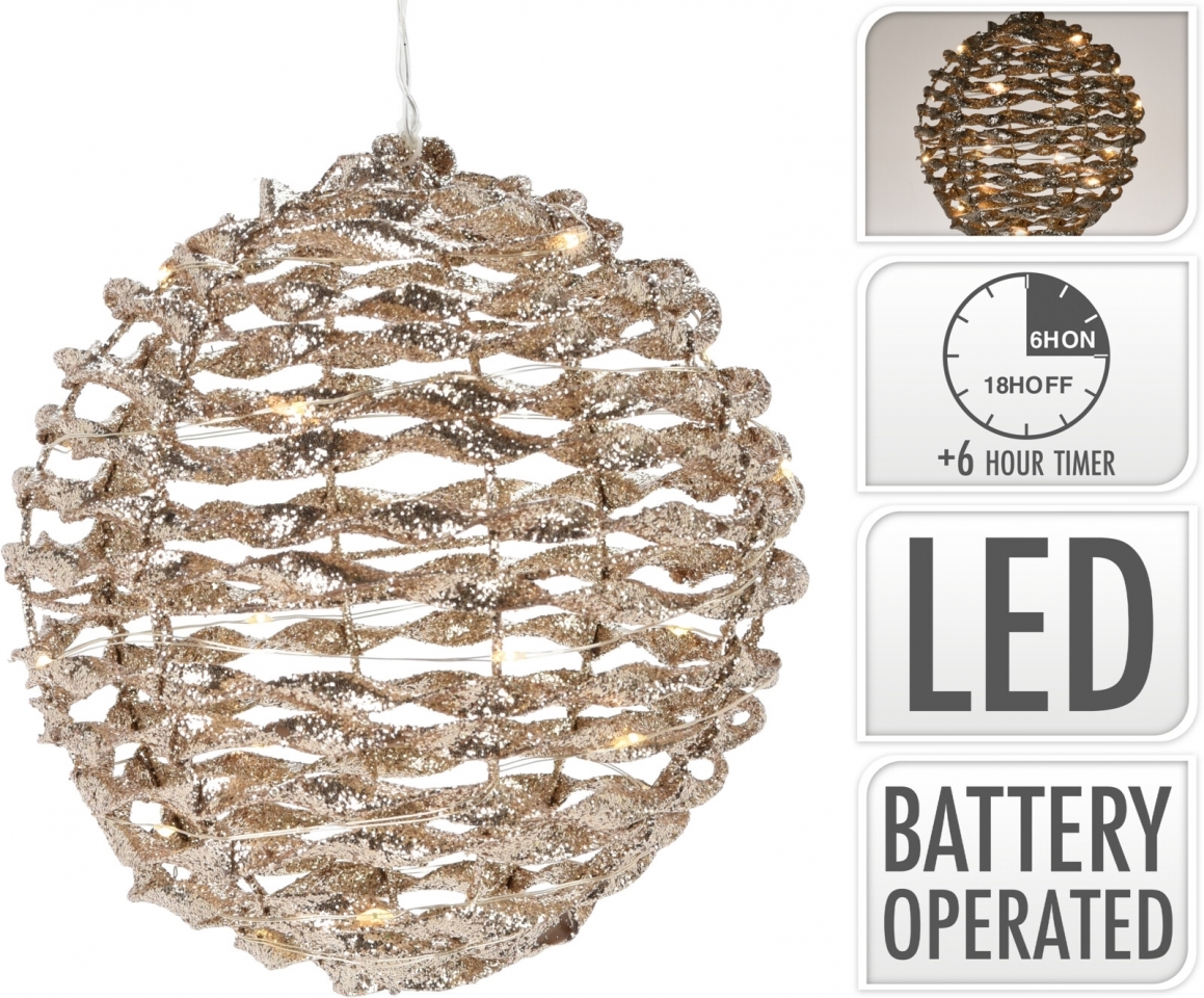 Kovová koule s 20 LED diodami teplé bílé barvy a zlatými glitry. Napájení 2x AA bateriemi (nejsou součástí výrobku). Součástí adaptéru IP20 časovač 6/18 h.Materiál: kov, plastové glitryRozměry:průměr 15 cm przeczytaj całość