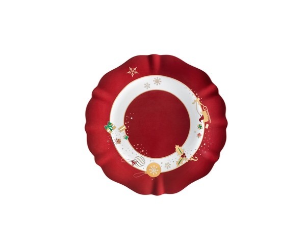 Servírovací tác kulatého tvaru z porcelánu v bílé/červené/zlaté barvě s vánočním vzorem. Ozdobí váš slavnostní stůl na Vánoce.