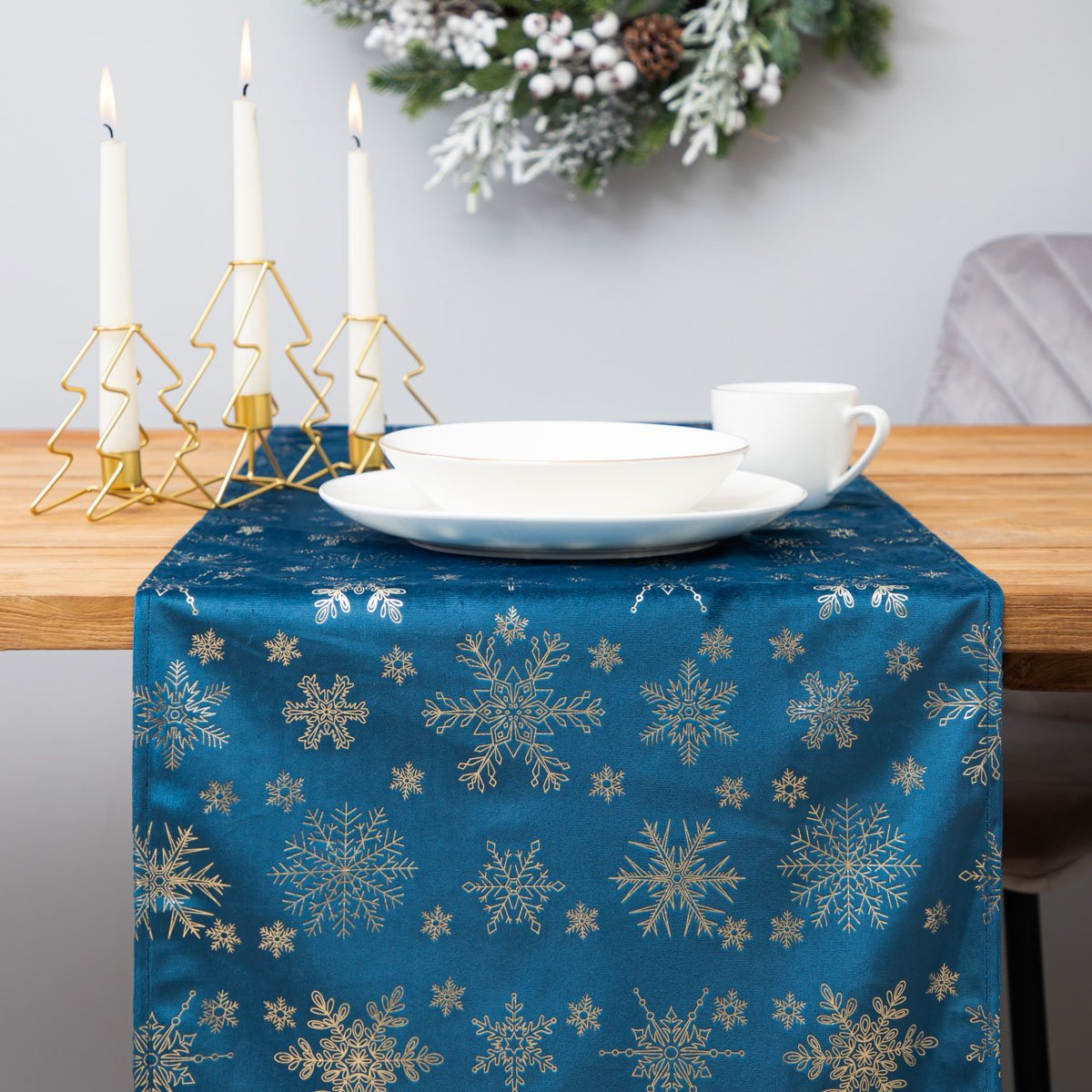 Vánoční běhoun na stůl | TANESI | ve zlatých sněhových vločkách tmavě modrá | 40x160 cm | XM22 979136 Homla