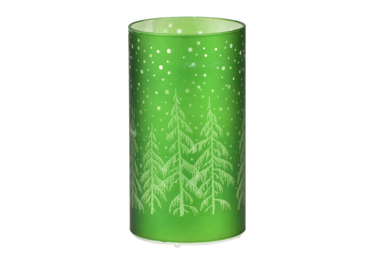 Skleněný LED svícen s prosvítajícím motivem stromečků. LED diod 10 ks, napájení 3x AA tužkové baterie. Baterie nejsou součástí výrobku.Materiál: sklo, plastRozměry:výška 16 cmprůměr 9 cm przeczytaj całość