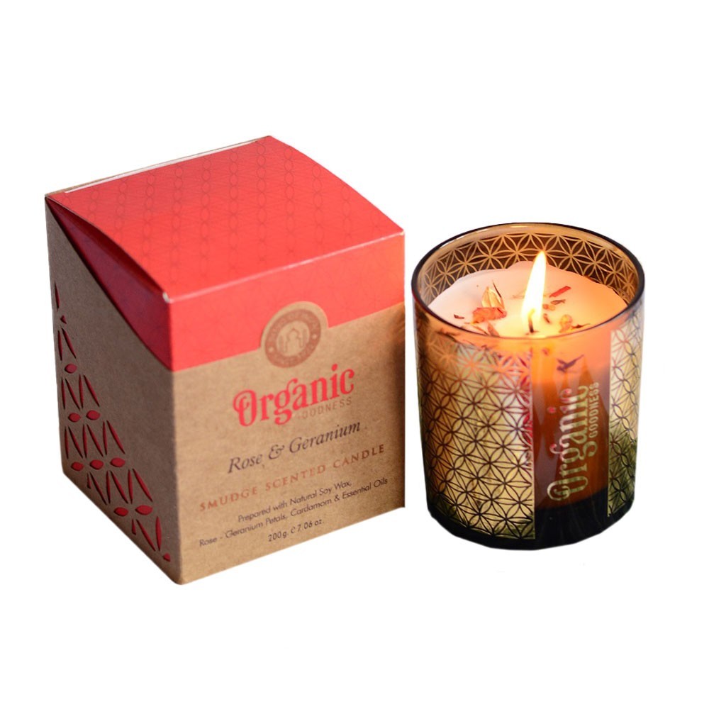ARÔME Organická vykuřovací svíčka 200g ve skle se zlatou fólií, Rose & Geranium