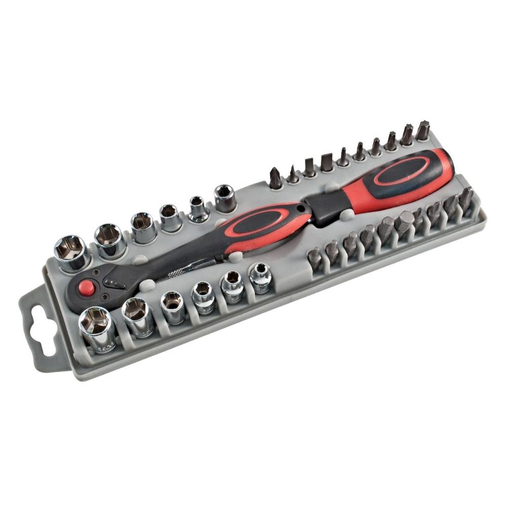 Sada 35ks bitů s ráčnou a šroubovákem.Obsahuje:Ráčnu a dvě různé rukojeti pro flexibilnější práci.Šikovná sada 35 kusů nářadí!Bity z chrom-vanadové oceli.Obsah:11 ks 1/4'' nástrčných hlavic: (O) 4 mm, 5 mm, 5.5 mm, 6 mm, 7 mm, 8 mm, 9 mm, 10 mm, 11mm, 12 mm, 13 mm20 ks bitů: (+) PH0, PH1, PH2,...