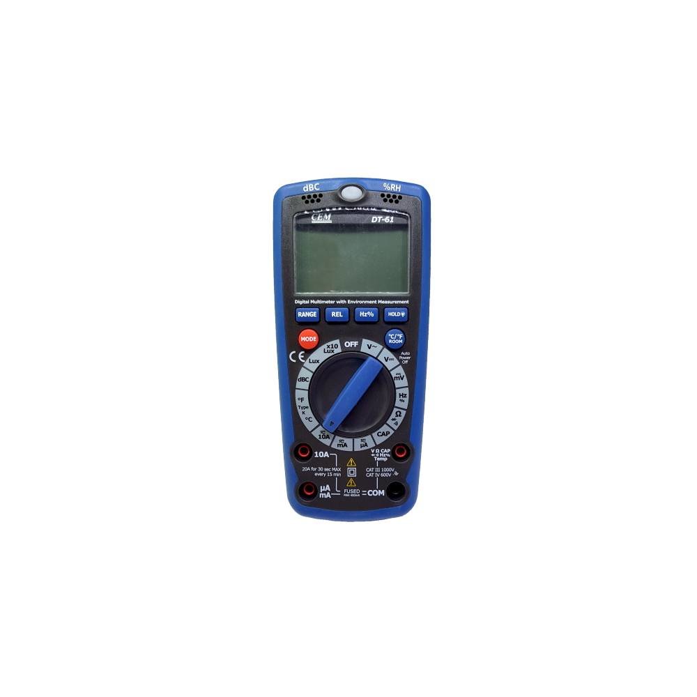 Univerzální multimetr s širou škálou doplňkových funkcí.Měří: Udc, Uac, Idc, Iac, Lux, Zvuk, R, frekvenci, vlhkost, teplotu, kapacitu, diodový test, vodivost.Parametry:Napětí DC:600V +-1,5%Napětí AC:600V +-2%Proud DC:10A +-2%Proud AC:10A +-2%Odpor:40MOhm +-2,5%Vlhkost:33..99% RH...