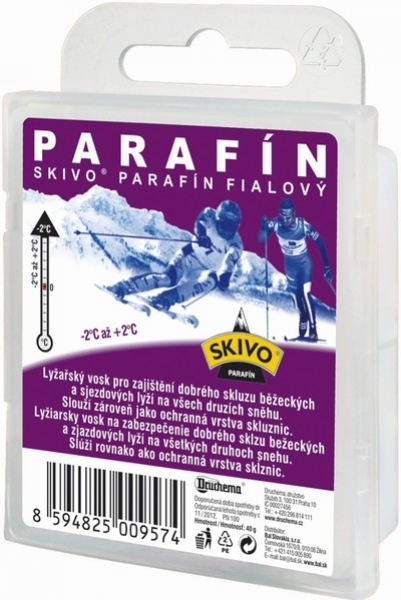 Instrukcja użycia: aby zapewnić trwałość woskowania, zalecamy wprasowywanie wosków parafinowych w ślizg. Wosk nakładaj na oczyszczony ślizg, pozbawiony pozostałości wosków i zabrudzeń. Żelazko rozgrzej do temperatury 120 - 140°C. Przyłóż wosk do żelazka i poczekaj, aż się rozgrzeje. Następnie zmiękczony wosk szybko przyłóż do ślizgu i rozprowadź. Powtórz czynność na całej długości ślizgu tak, aby utworzyć wystarczająco grubą warstwę wosku (zapobiegnie to bezpośredniemu kontaktowi żelazka ze ślizgiem). Teraz wprasuj wosk w ślizg, zawsze zachowując kierunek prasowania od dziobu do pięt. Wosk powinien jedynie topić się, jedno przeciągnięcie powinno trwać około 20 sekund. Pozostaw narty do ostygnięcia w temperaturze pokojowej. W tym czasie ślizg „wciągnie” potrzebny wosk w pory. Nadmiar wosku usuń za pomocą skrobaczki Skivo plexi. Na koniec przeszczotkuj ślizg miękką szczotką polerską i wypoleruj ściereczką Skivo.