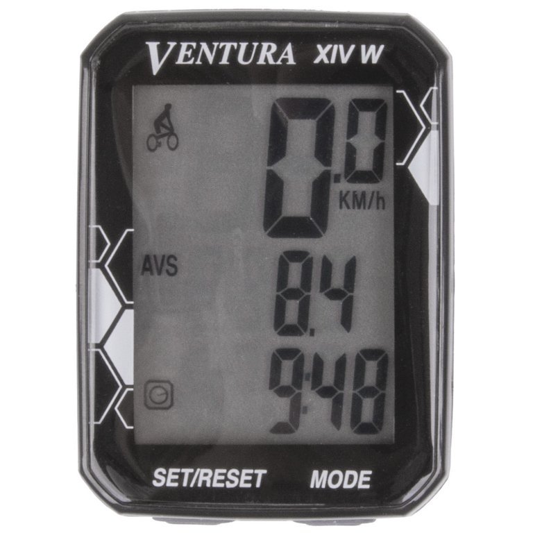 14 funkcji: - prędkość: aktualna, średnia, maksymalna - odległość: trasy, całkowita - zegar - stoper - kilometry lub mile - automatyczny start/stop - regulowany rozmiar koła