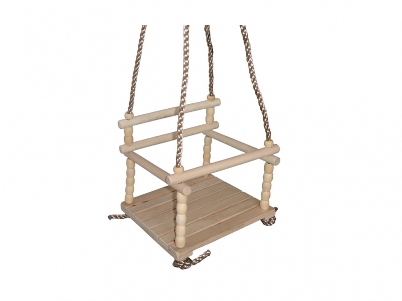 Houpačka dřevěná (dětská). Rozměry sedáku 30 cm na šířku a29,5 cm na délku. Výška opěrátka od sedáku je 26 cm. Délka provazu, jeod sedáku, po místo zavěšení kroužku – 140 cm. Nosnost do 40 kg.Výrobek není vhodný pro děti do 3 let. przeczytaj całość