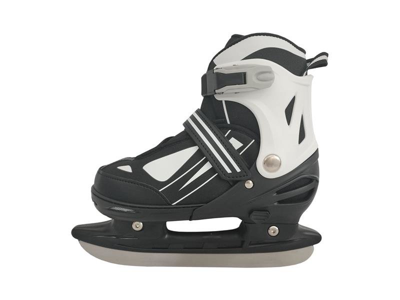 Hokejové brusle ACTION, roztahovací - 4 velikosti v jedné. Jednoduché nastavení boty na čtyři velikosti 39-42 = 25-27 cm. Délka vnitřní stélky, při nejmenší nastavené velikosti, činí 25 cm. Brusle jsou tvořeny plastovým skeletem a vnitřní textilní botičkou, která má měkkou výstelku pro zabezpečení nejvyššího komfortu. Pro dosažení řádného upevnění na nohu je k dispozici klasické šněrování, textilní přezka na suchý zip a plastová přezka. Brusle mají vodoodpudivou povrchovou úpravu (impregnaci), která zabraňuje pronikání vlhkosti do boty a zároveň tak znemožňuje prochladnutí nohy. Přesto doporučujeme občas brusle naimpregnovat běžně dostupnými impregnačními prostředky.Postup pro nastavení bruslí: Páčku, na spodní straně bruslí, vytočíme o 90 st., kolmo k noži. Potom lze botu vytahovat a zatahovat, dle potřeby. Následně je třeba páčku zajistit do původní polohy tak, aby byla souběžně s nožem brusle. ( Páčku lze natočit na obě strany, je třeba dodržet zásadu, že musí být nasměrována souběžně s nožem... ).