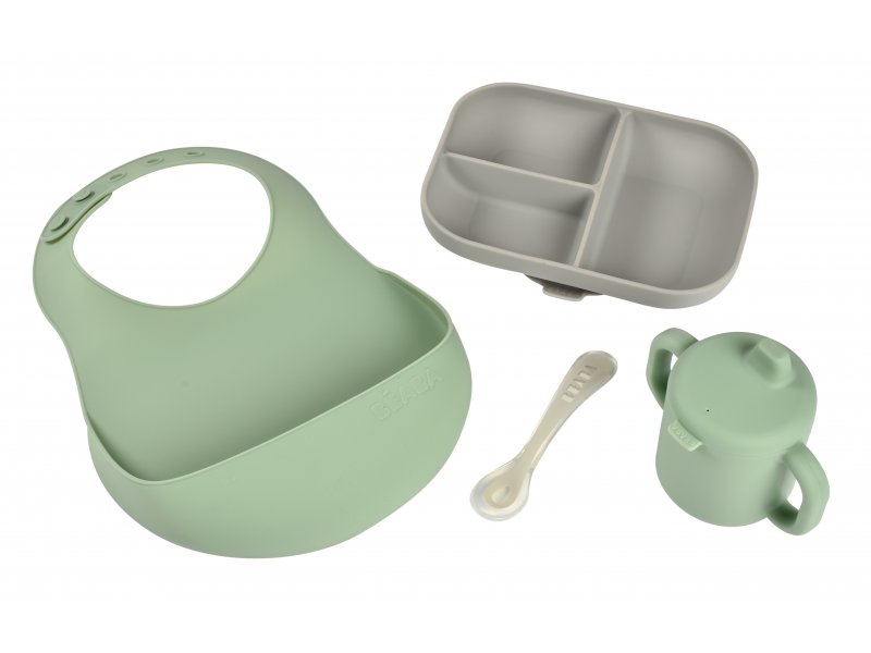 Jídelní sada silikonová 4-dílná s bryndákem Grey / Sage Green