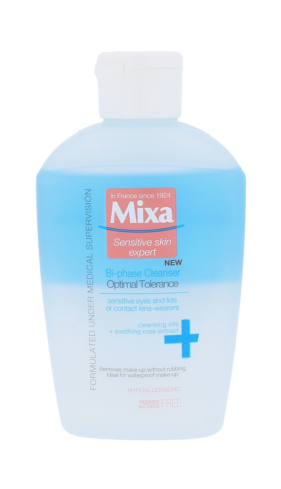 Płyn do demakijażu okolic oczu **Mixa Bi Phase Cleanser**. Płyn Mixa Bi Phase Cleanser jest odpowiedni dla osób z wrażliwymi oczami oraz dla nosicielek soczewek kontaktowych. Bardzo delikatne składniki nie podrażniają skóry, łagodnie usuwają makijaż i zanieczyszczenia. Ten wyjątkowy płyn zawiera 2 fazy: olejową i wodną. **Sposób użycia**: Nanieść na skórę za pomocą wacika.