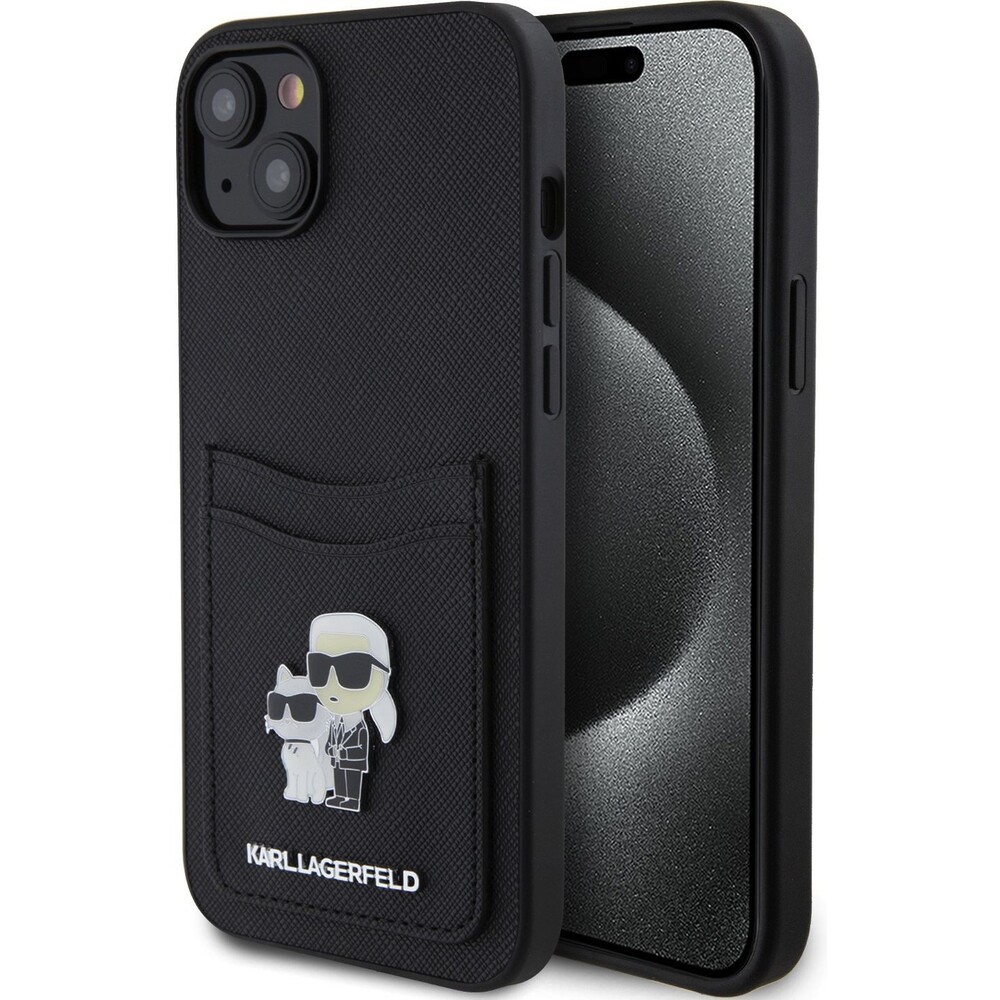 Karl Lagerfeld PU Saffiano Card Slot Metal Karl and Choupette Kryt iPhone 15 černý