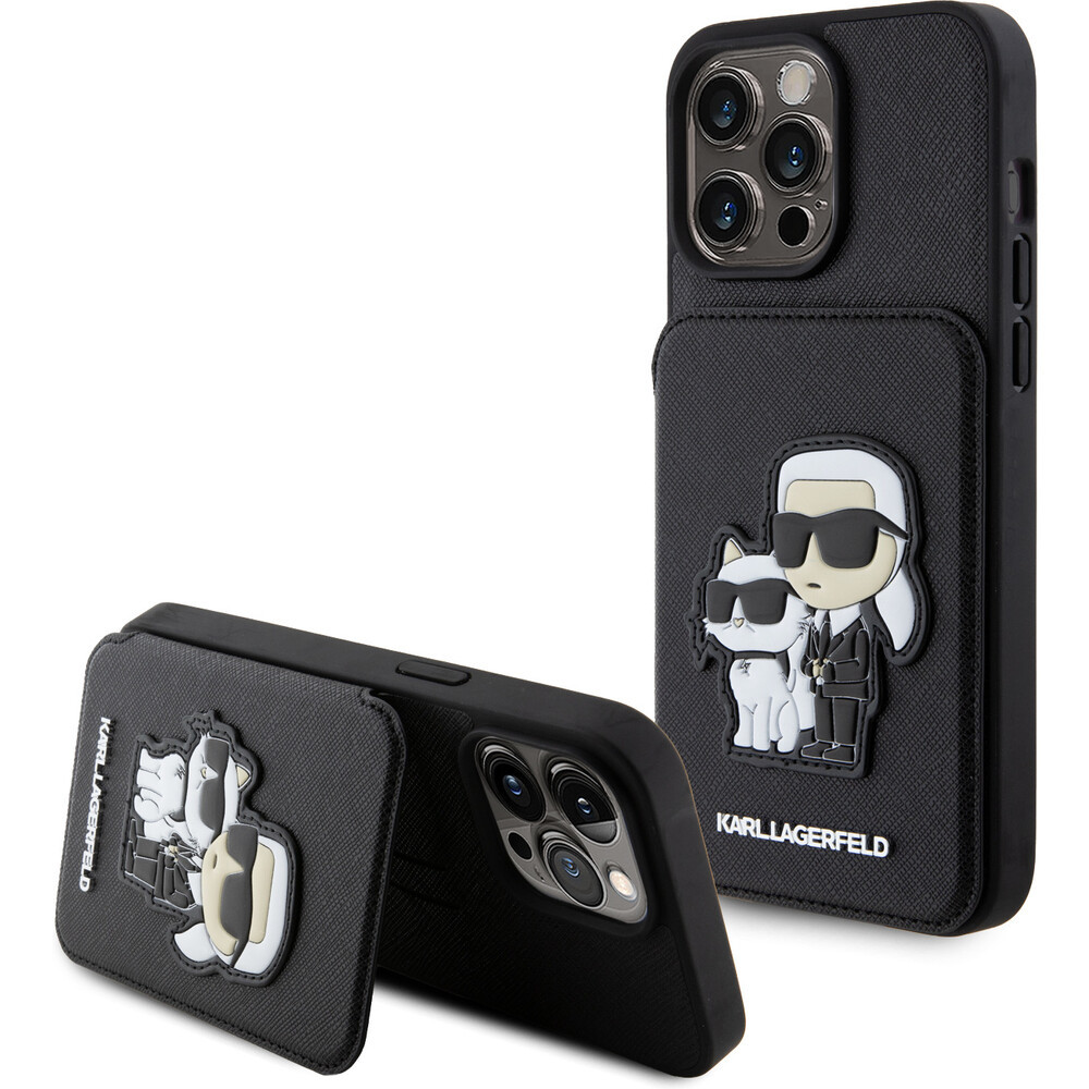 Karl Lagerfeld PU Saffiano Card Slot Stand Karl and Choupette Kryt iPhone 15 Pro Max černý