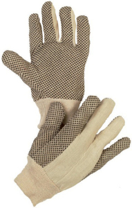 Bavlněná tkanina s PVC terčíky na dlani a prstech, pružný náplet. Ochrana před mírnými mechanickými vlivy v suchém prostředí, vhodné pro stavebnictví, strojírenství, sklady, malování. przeczytaj całość