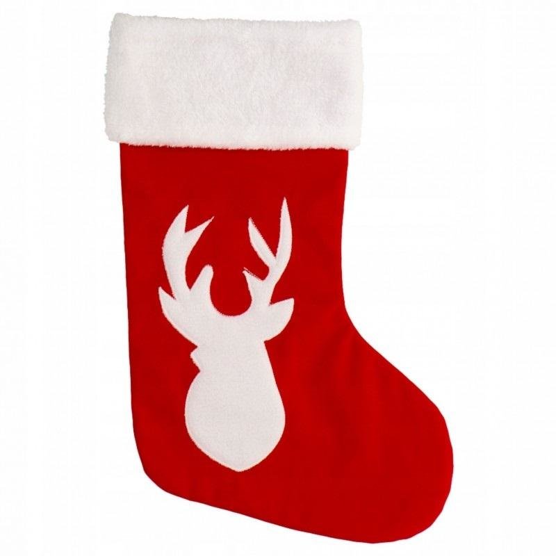 Dekoracyjna skarpeta świąteczna / but na prezenty. Wykonana z przyjemnego i miękkiego materiału. Górna część wykończona białym futerkowym materiałem. Z przodu tekstylna aplikacja przedstawiająca renifera.Bardzo gustowna i stylowa.Wykonana z wysokiej jakości materiałów.