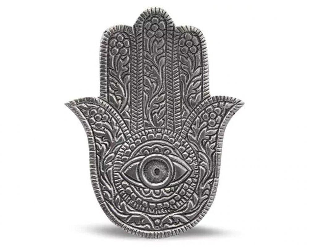 Stojánek na vonné tyčinky v podobě symbolu nazývaného Hamsa, Chamsa, Ruka Fátimy nebo také ruka Marie. Jedná se o symbol ochrany a to především proti zlým silám. Pokud je navíc na amuletu vyvedeno oko, jde rovněž o ochranu proti uhranutí.Rozměry: cca 12 x 9,5 x 0,8 cm. przeczytaj całość