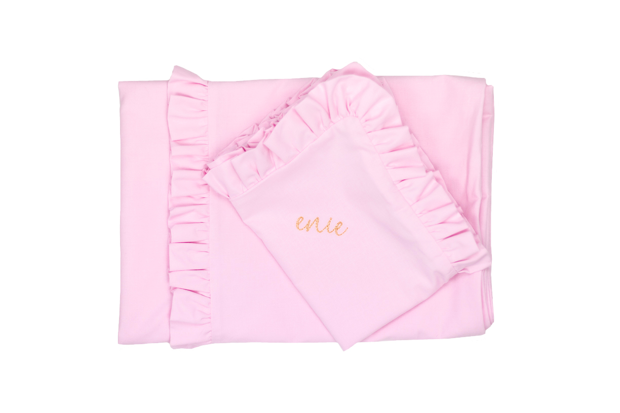 Povlečení do postýlky o rozměrech na přikrývku 100x135cm a polštářek 40x60cm. Bavlněná látka je velmi jemná a hladká. Volánky zdobí polštářek ze 3 stran a na přikrývce z jedné strany.Na polštářku i peřince jsou skryté zipy, které netlačí. Z jedné strany je potištěná látka pomocí technologie...